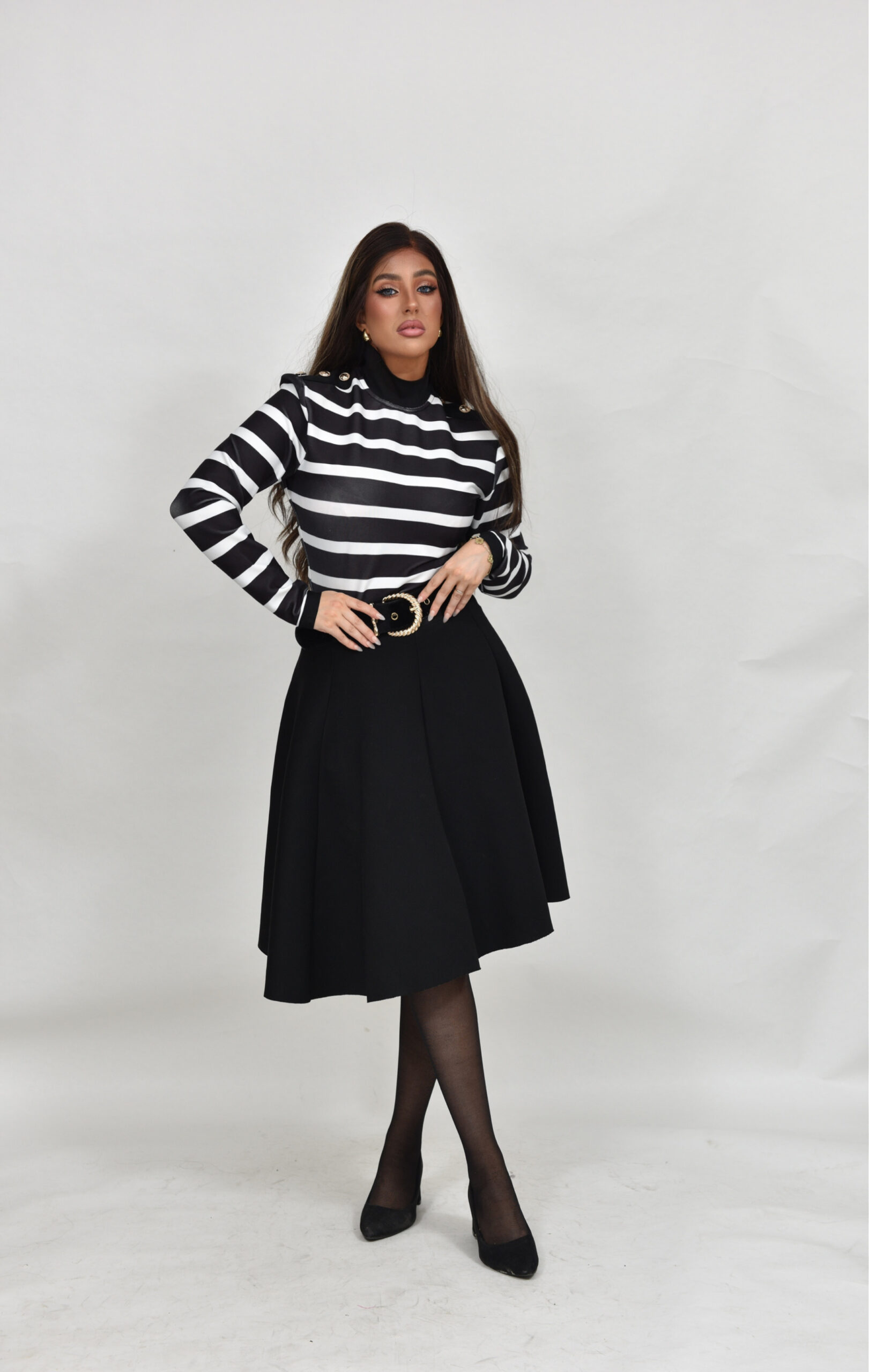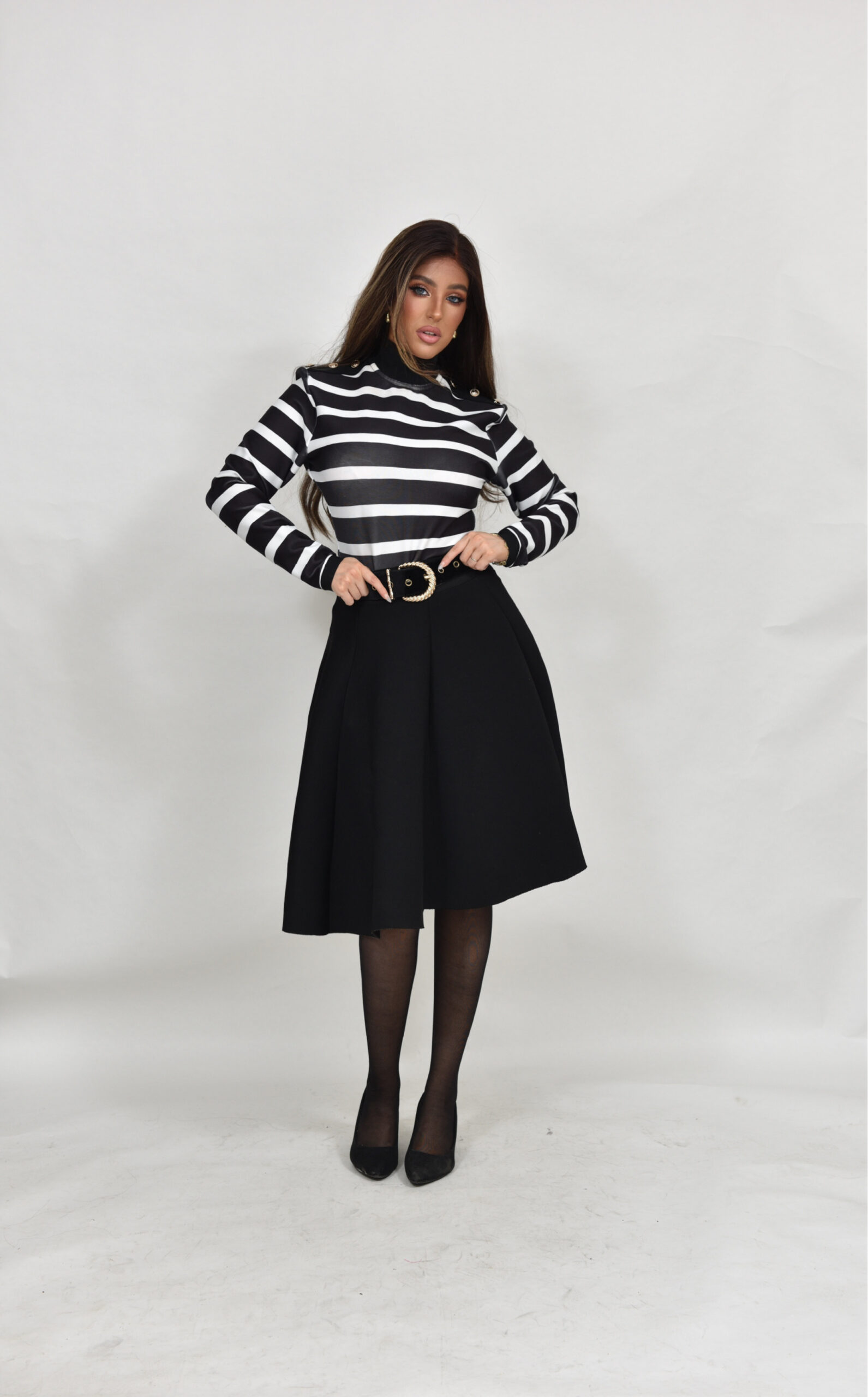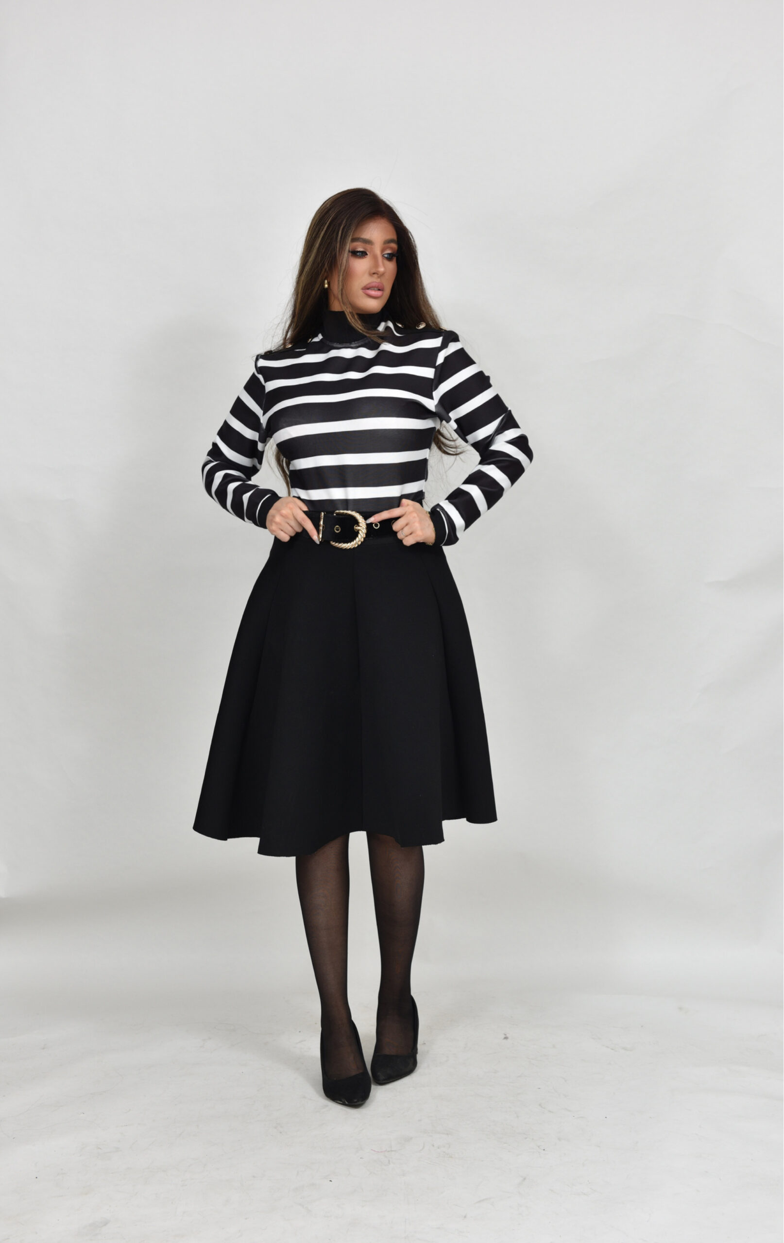 חולצת באנדג לייקרה מושלמת עם פסים שחור לבן וכפתורי זהב בכתפיים, רוכסן מאחורה, יושבת מושלם ומתאימה לחצאיות במלא צבעים!