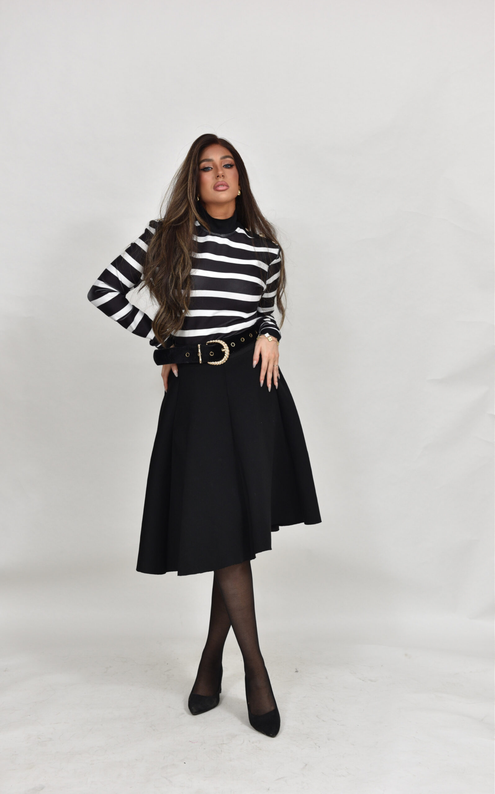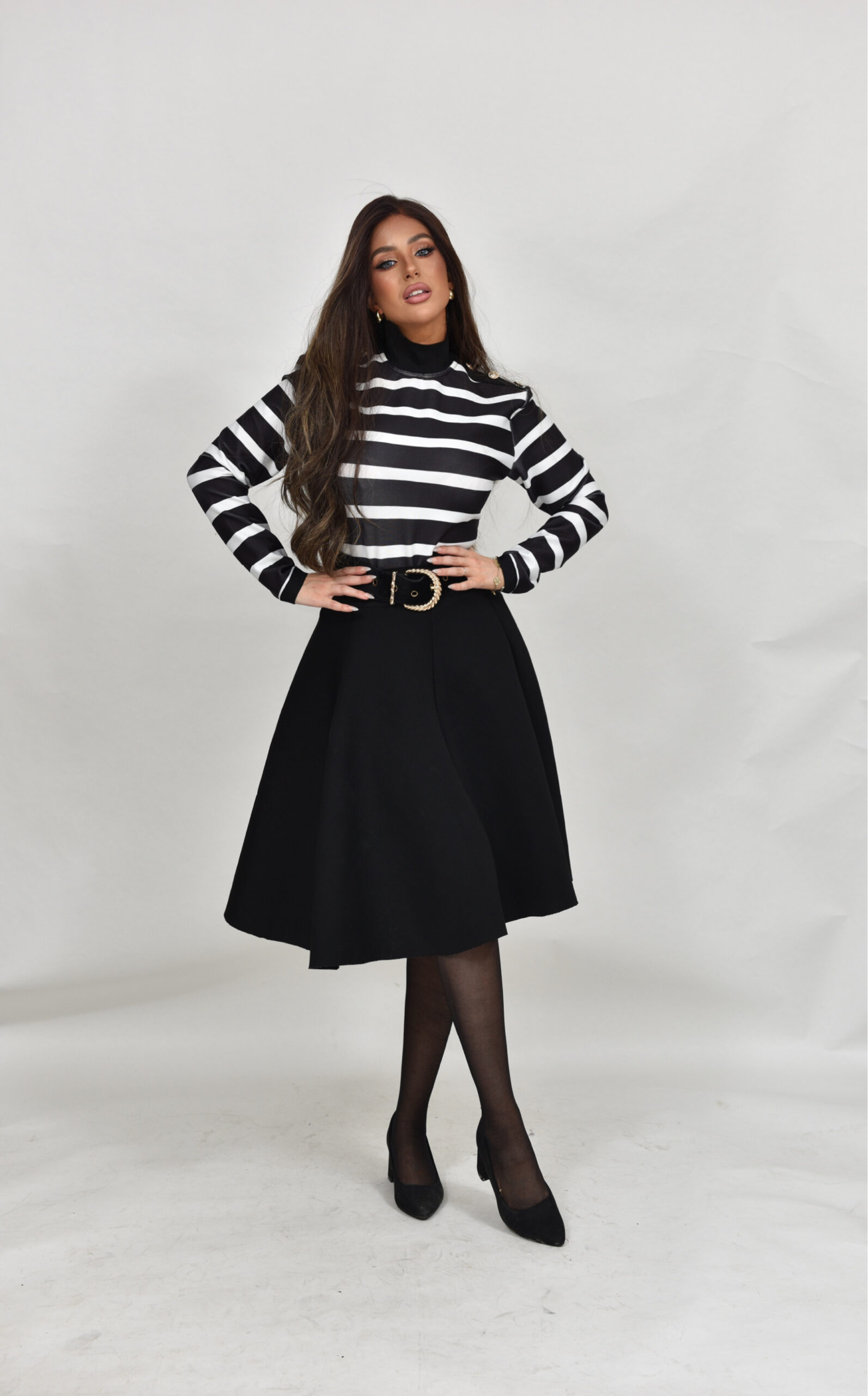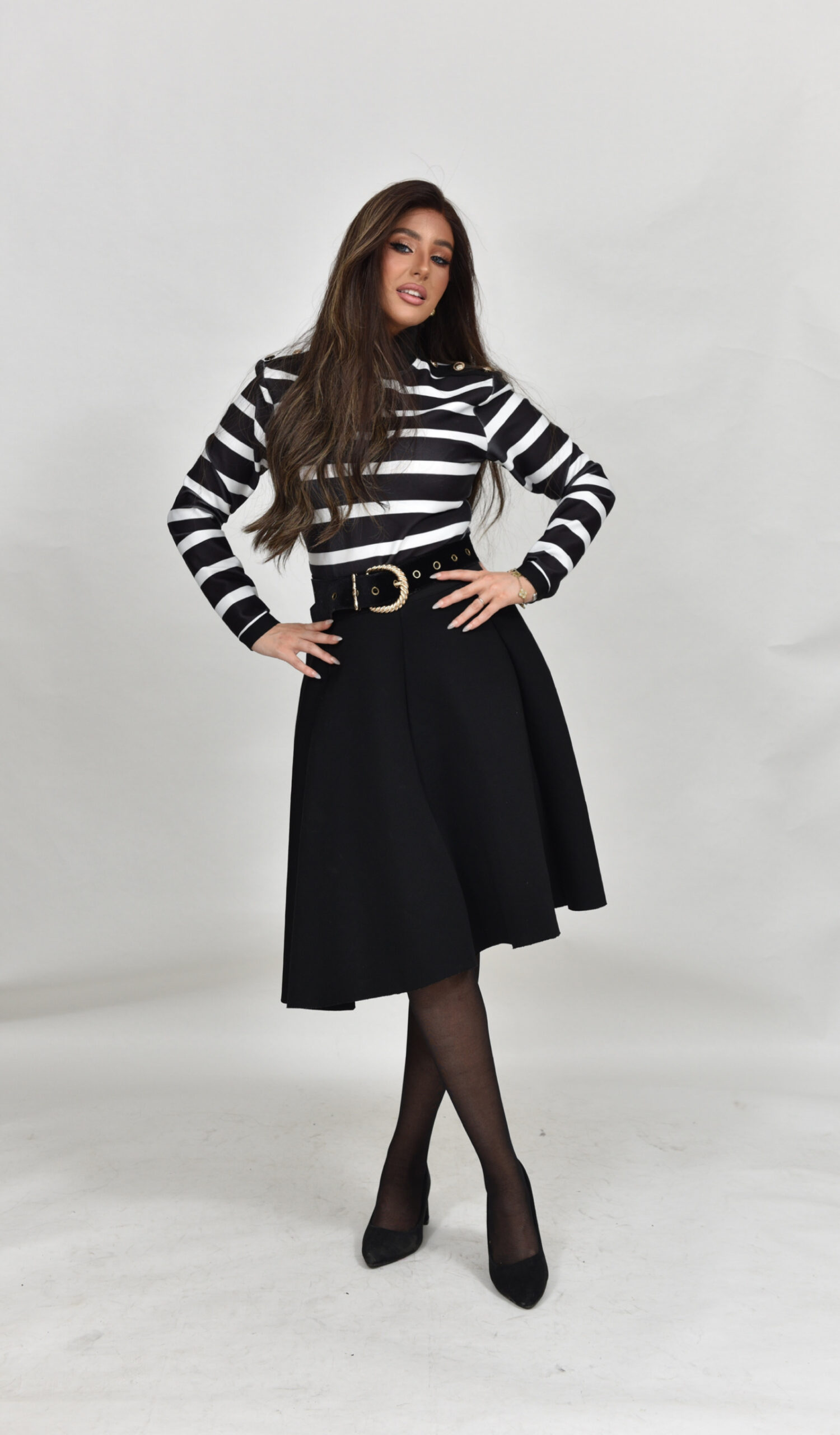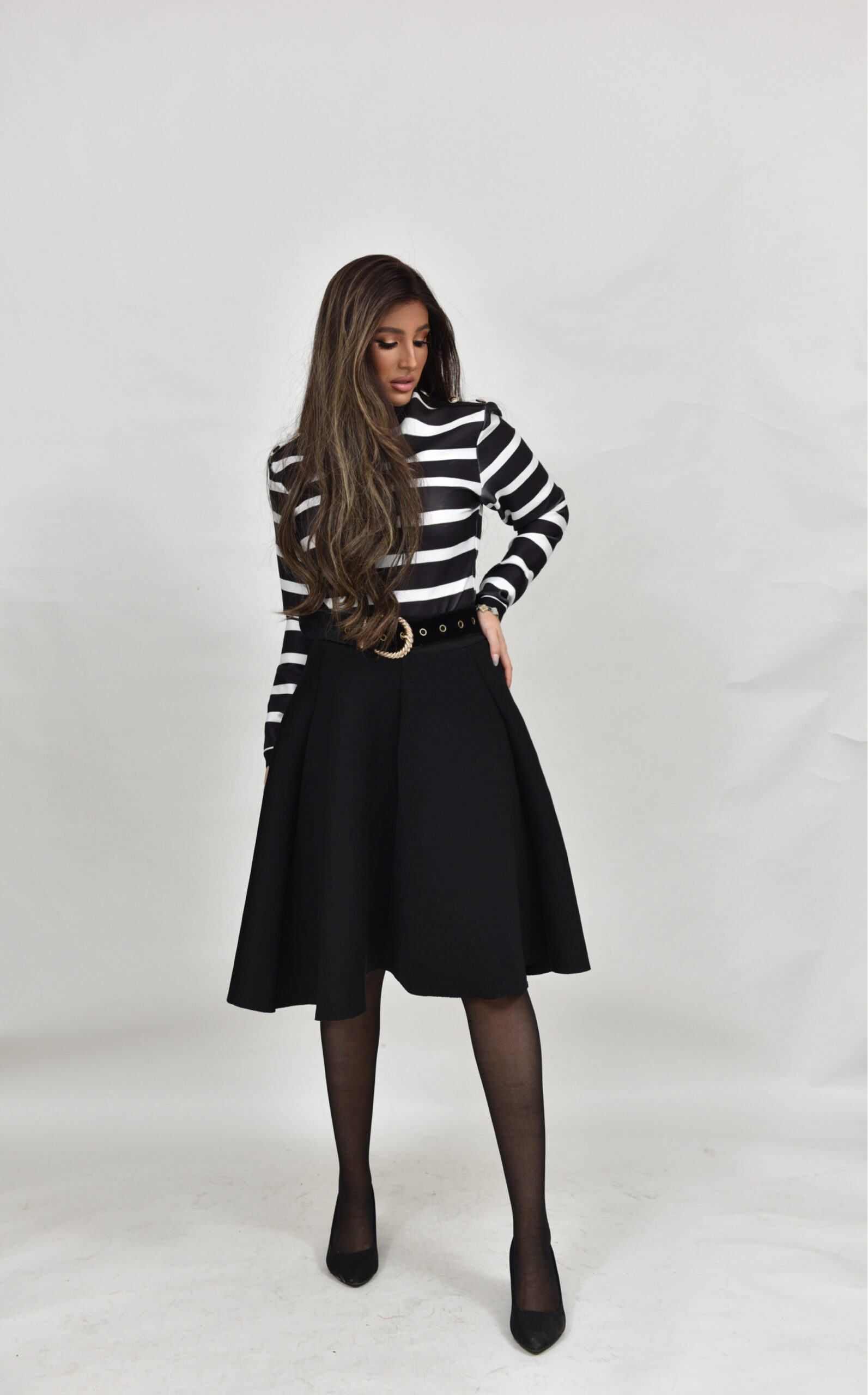 חולצת באנדג לייקרה מושלמת עם פסים שחור לבן וכפתורי זהב בכתפיים, רוכסן מאחורה, יושבת מושלם ומתאימה לחצאיות במלא צבעים!